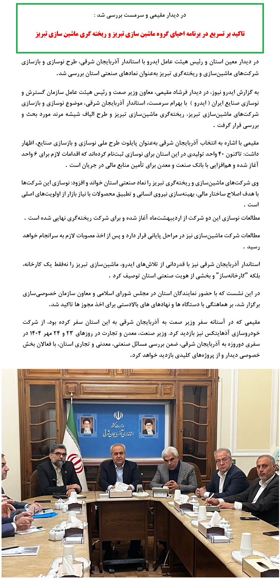 تاکید بر تسریع در برنامه احیای گروه ماشین سازی تبریز و ریخته گری ماشین سازی تبریز
