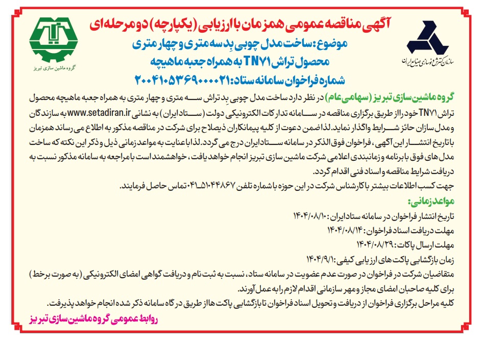آگهی مناقصه ساخت مدل چوبی BED سه متری و چهار متری تراش TN71 به همراه جعبه ماهیچه