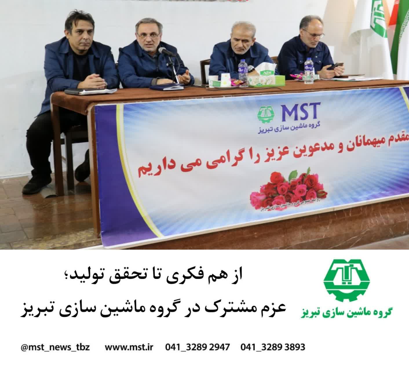 نشست هماندیشی مهندس قربانی سرپرست گروه ماشینسازی تبریز و مهندس یاوری عضو هیأتمدیره این گروه، با حضور مدیران، رؤسا و مسئولان کارگاههای خطوط تولید و بخشهای پشتیبانی، با محوریت بررسی راهکارهای افزایش تولید و جبران انحراف از برنامه تولید برگزار شد.